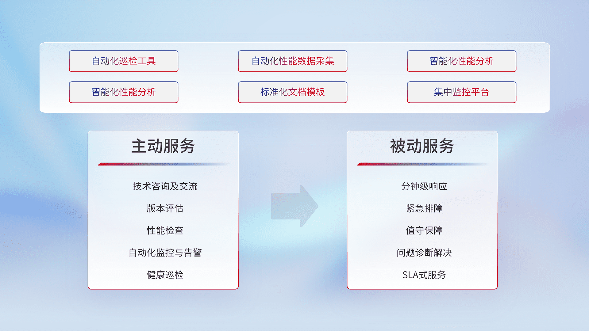 智能化工具和标准化文档,,保障服务质量,,,,提供主动服务(包含技术咨询、、版本评估、、、、性能检查、、、自动化监控与告警、、、、健康巡检)和被动服务包含(分钟级响应、、、、紧急排障、、、值守保障、、、问题诊断解决、、、、SLA服务)。。。